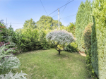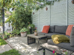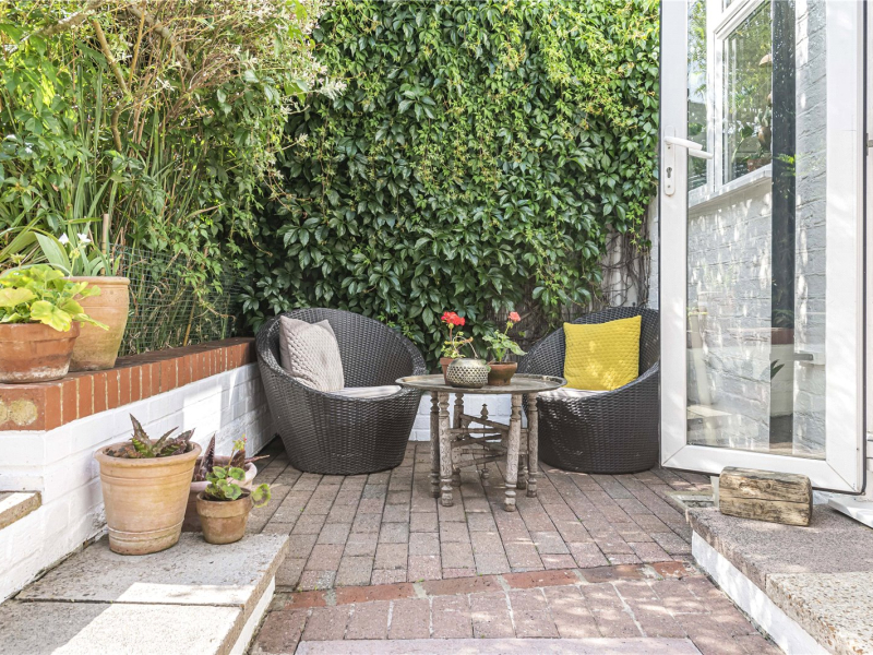 The rear garden is well-established, featuring mature shrubs and bushes, with a patio seating area ideal for relaxing or entertaining during the warmer months.