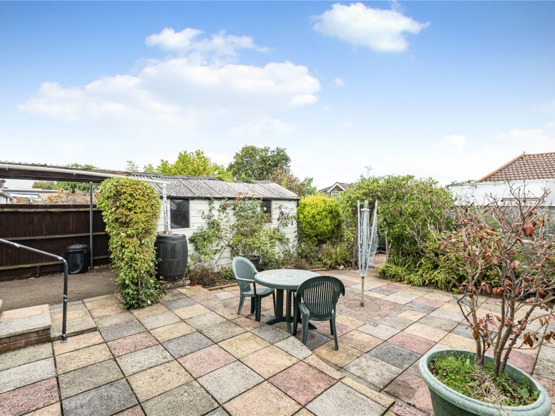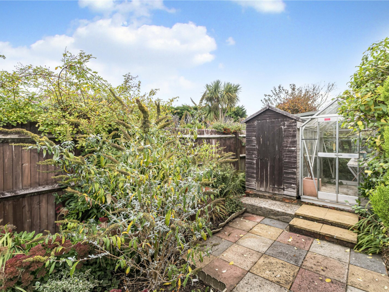 The private rear garden features a patio area and a variety of mature shrubs and bushes, offering a low-maintenance yet attractive outdoor space. A standout feature is the large workshop/storage area, complete with electricity and lighting – ideal for hobbies, a home office, or additional storage.