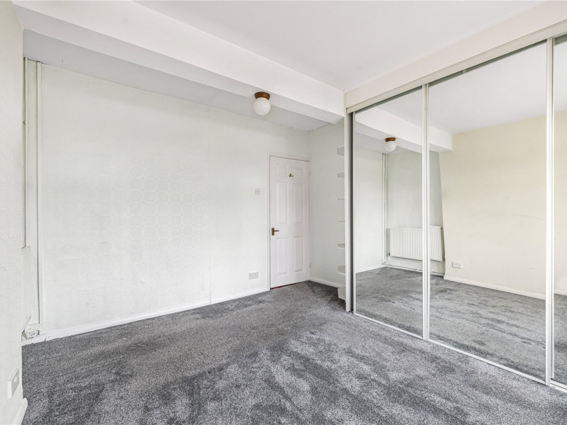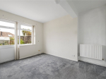 The bright and spacious living room features a large bay window and a gas fireplace, offering ample space for freestanding furniture. Beyond this room is the main bedroom, which benefits from built-in storage and views over the rear garden.