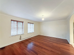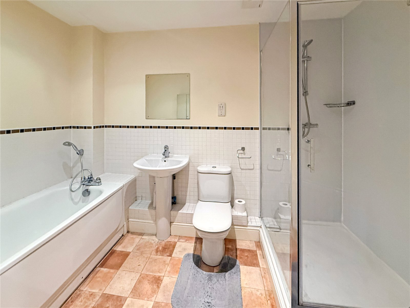 Presented in neutral décor throughout, the property comprises an entrance hallway, a generous master bedroom with built-in wardrobes, a second double bedroom, and a large bathroom featuring both a bath and a separate walk-in shower.