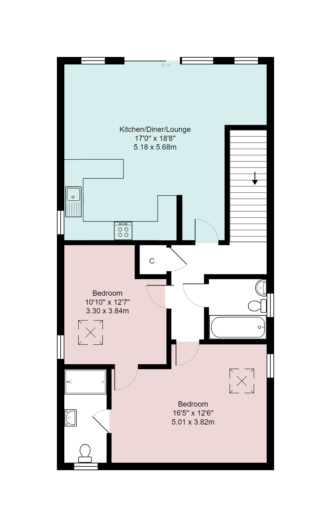 The apartment offers a large open planned kitchen diner/lounge with a large window offering an abundance of light. The kitchen offers ample storage and worktop space and integrated appliances.