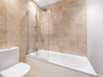 The family bathroom includes a bath with overhead shower, WC and wash basin.