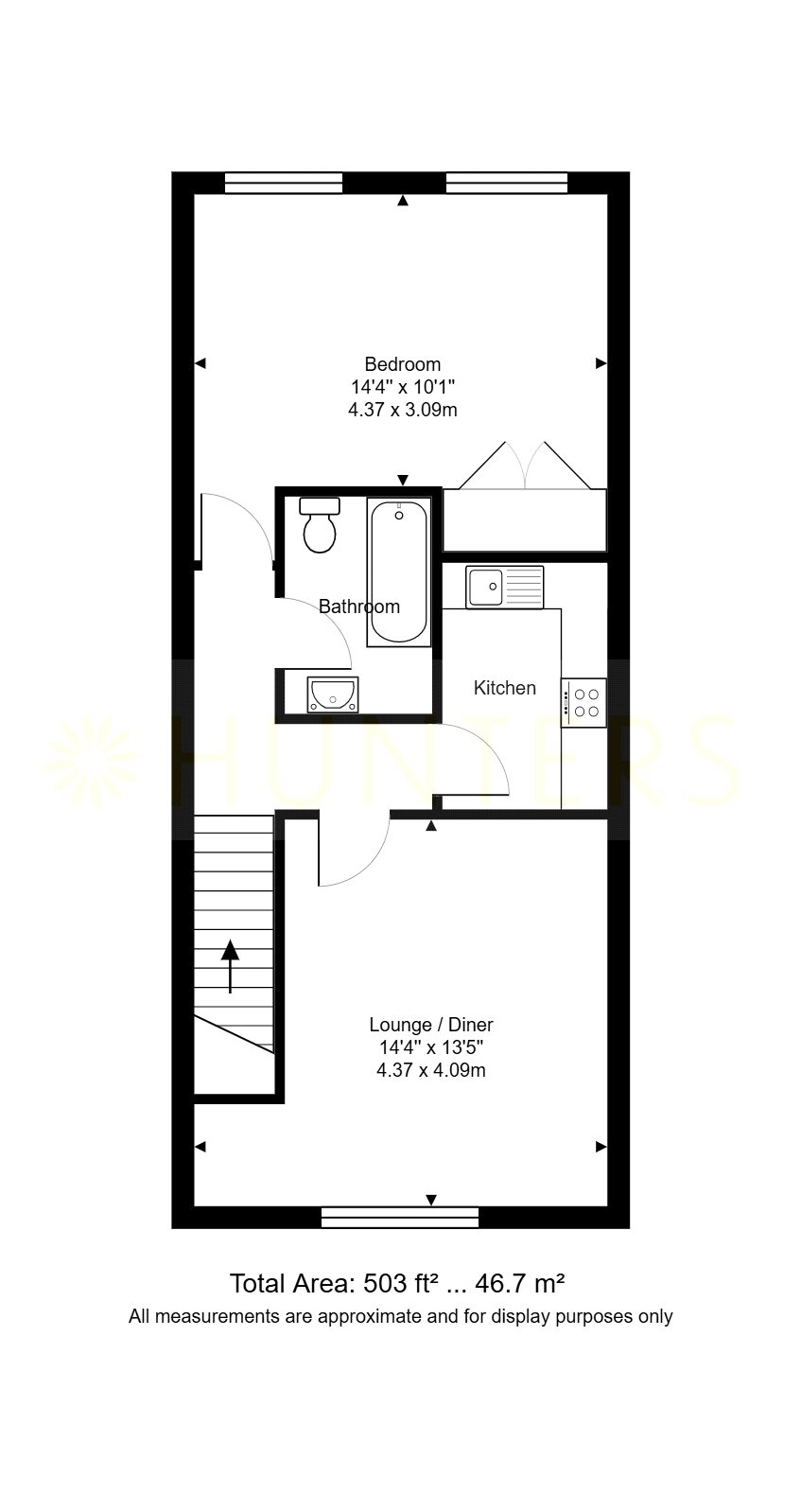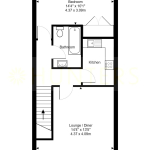To the front of the property, there is a private entrance door with stairs ascending to the flat.
