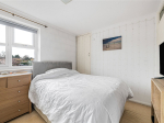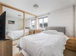 The principal bedroom features a large built-in wardrobe with mirrored sliding doors, along with an additional over-stairs storage cupboard which houses the boiler.