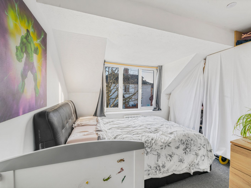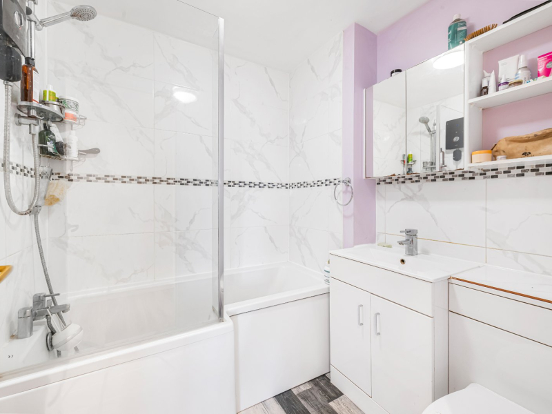 The bedroom, to the front, boasts built-in wardrobe space, is fully carpeted and includes double-glazed windows looking out to the front of the property. The apartment benefits from a modern white bathroom suite, with shower-over-bath, pedestal sink, toilet and fitted wall-hung cabinet. The property offers ample storage space with hatch to loft, a storage cupboard and airing cupboard both in the hallway.