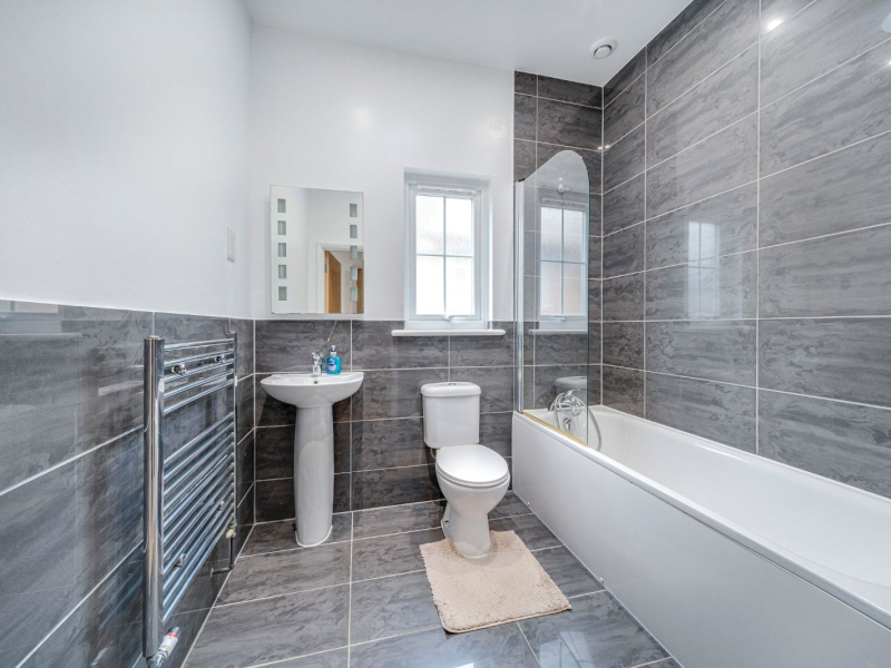 The second bedroom is also a spacious size, and benefits from a window to the side and overhead Velux window, provided lots of natural light, similar to the Master Bedroom. Opposite, is the family bathroom which comes mostly tiled with modern ceramic tiles, a bathtub with glass screen and shower head, a half wall-mounted radiator, wall-mounted mirror with lighting, and a toilet and sink.