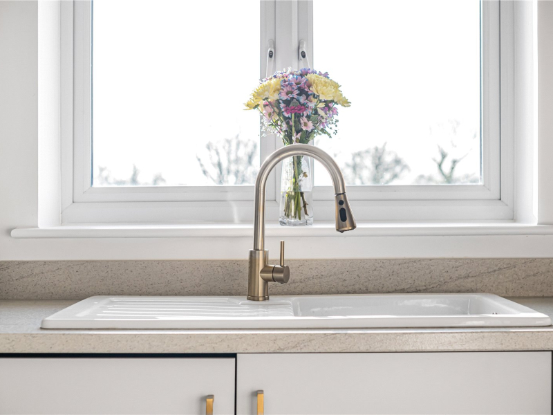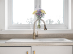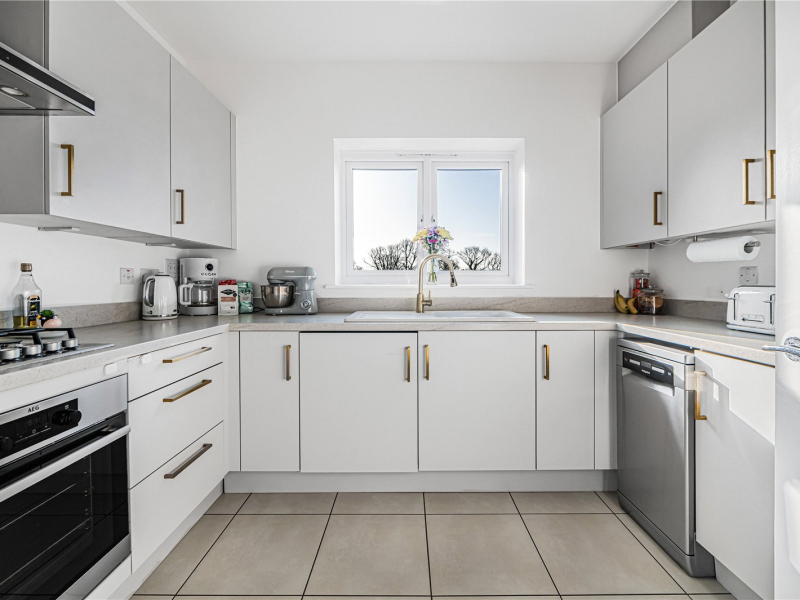 Upon entering the apartment, there are two generous storage cupboards, one of which houses the water tank. The kitchen is well-equipped with an integrated washing machine, space for a slimline dishwasher and room for a tall freestanding fridge/freezer. There is ample wall and base unit storage, finished in neutral tones with stylish gold handles.