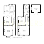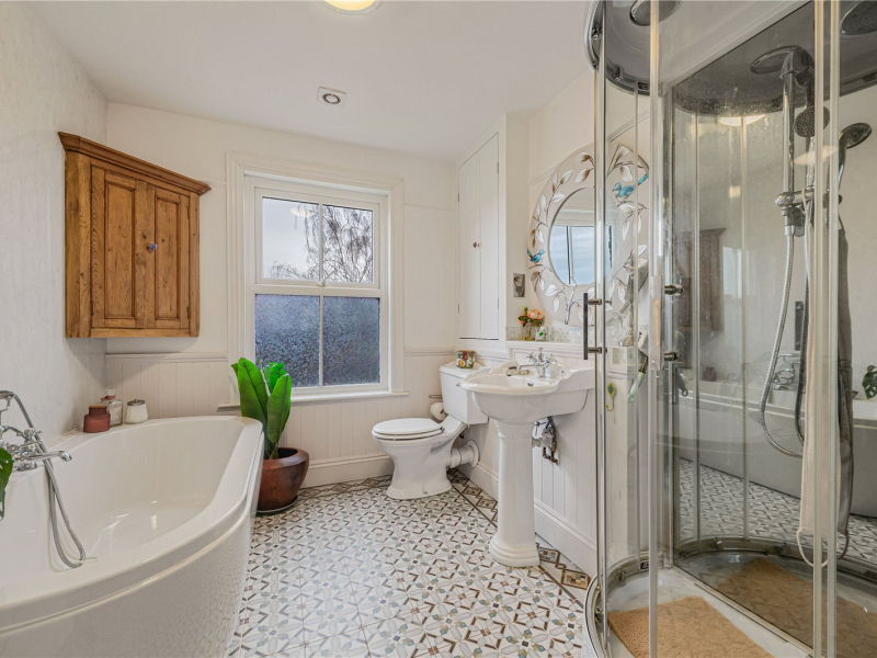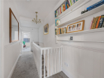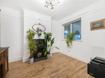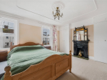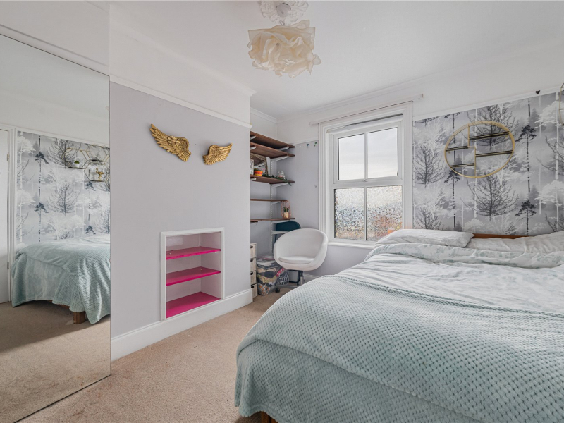 On the first floor, the family bathroom is fitted with a bath, walk-in shower, WC, and hand basin. The room has been renovated and includes immaculate flooring with additional built-in storage. The master bedroom, positioned at the front of the property, boasts two sash windows, an original fireplace, ceiling coving, and built-in storage. The second bedroom is also a comfortable double, offering views over the rear garden and fitted storage. The landing also benefits from a large storage cupboard with a fitted radiator, ideal for airing laundry or general storage needs.