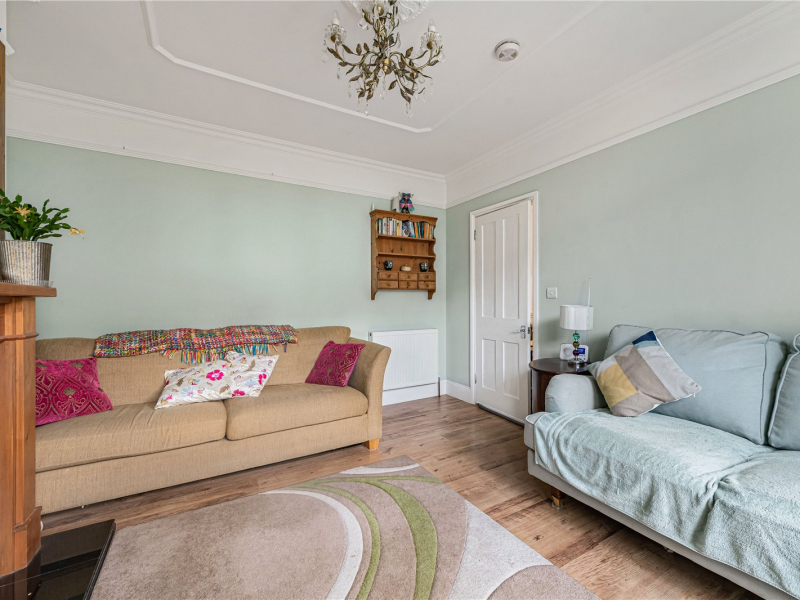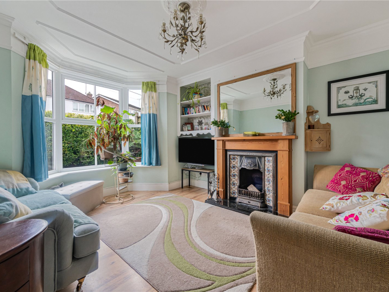 Upon arrival, the property benefits from a low-maintenance front garden. Stepping inside, you are welcomed by a spacious hallway. To the left sits the bright and airy living room, featuring a large bay window overlooking the front garden, a charming feature fireplace, and built-in storage on either side.