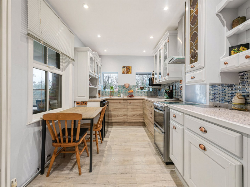 The dining room also features a fireplace and offers an ideal setting for formal dining or use as an additional reception room. The kitchen is well-designed, with space for a breakfast table and freestanding appliances, including a dishwasher, fridge/freezer, and oven with hob. From the kitchen, access leads to the lean-to, currently used as a utility area, perfect for extra storage or as an additional seating space during the warmer months. From here, there is direct access to the rear garden.