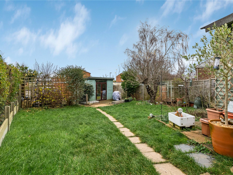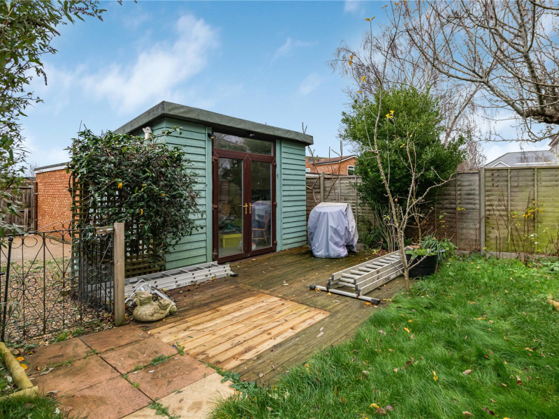 The west-facing rear garden offers ample space for outdoor seating and features several mature fruit trees, including cherry, apple, and pear. At the end of the garden sits a well-equipped summer house, complete with lighting and electricity—ideal as a home office, studio, or workshop and further scope for a loft conversion (STPP), giving the property even more future potential.