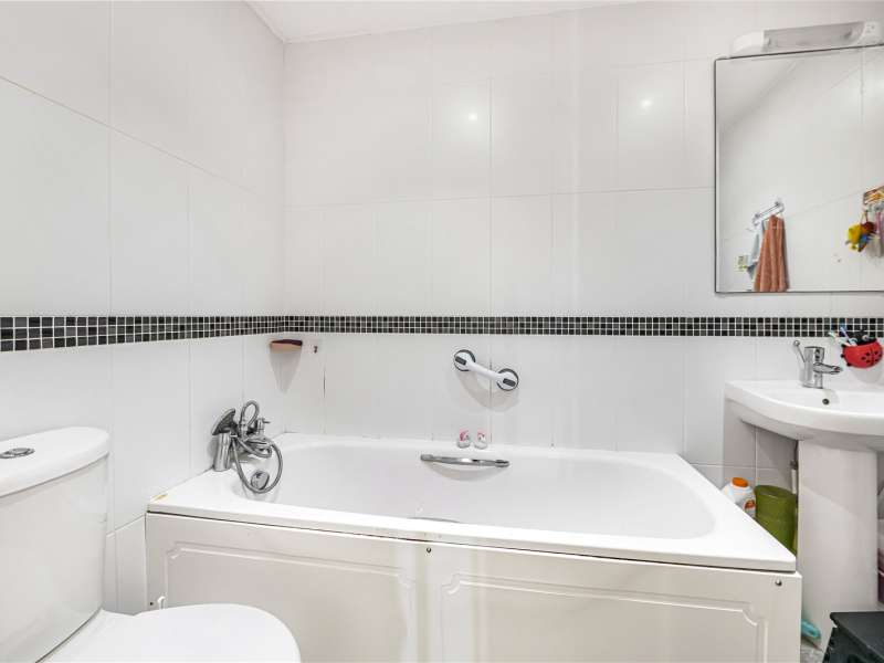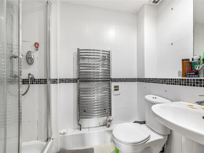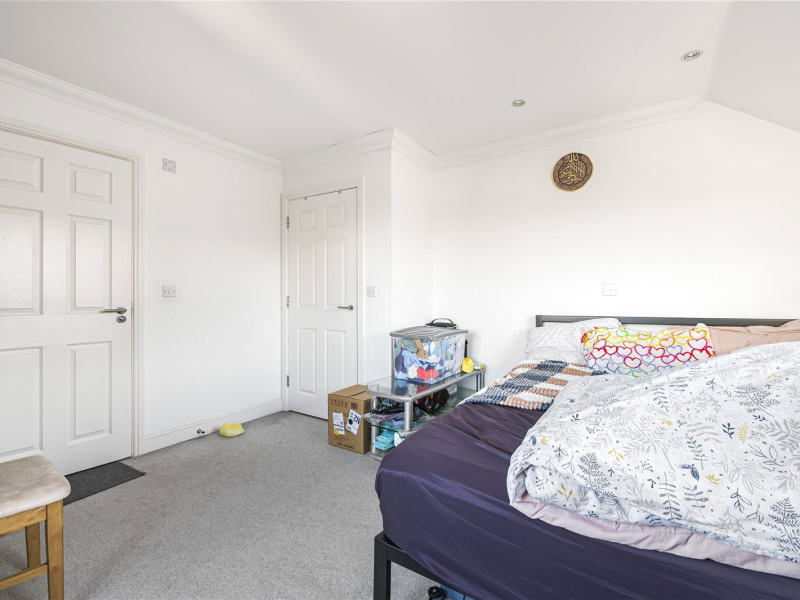 The master bedroom is bright and airy, benefiting from dual-aspect windows and offering plenty of space for free-standing furniture. It also includes a modern en-suite with walk-in shower, WC, and washbasin. The second bedroom is also a comfortable double and offers flexibility as a guest room, home office, or additional storage.