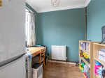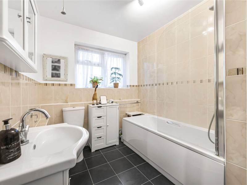 From the living room, a hallway leads to two double bedrooms, both offering space for free-standing furniture. The bathroom is fitted with neutral tiling and comprises a bath with overhead shower, WC and wash hand basin.