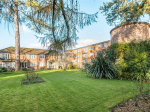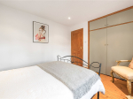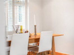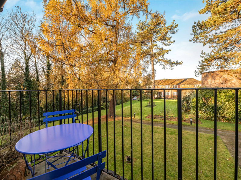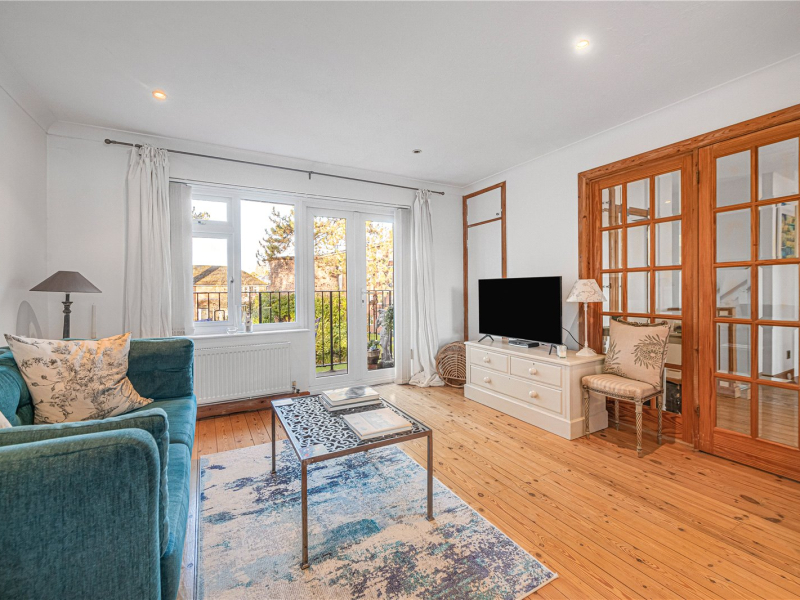The bright and airy living/dining room benefits from dual-aspect windows that fill the space with natural light. French doors lead out to a private balcony, ideal for seating during the warmer months. The room also provides ample space for free-standing furniture and includes a further large storage cupboard.