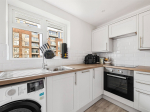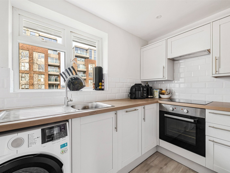 The kitchen has been newly fitted in July 2025 and features stylish shaker-style units with wood-effect worktops, an integrated dishwasher, built-in oven and hob, and space for additional appliances.