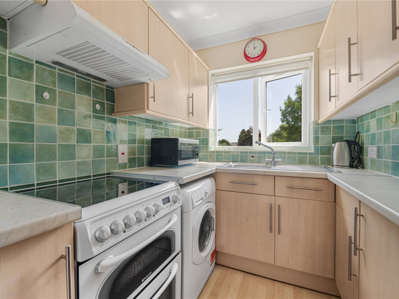 To the left is the second bedroom, a generously sized space with room for free-standing furniture. Adjacent to this is the well-equipped kitchen, designed in a practical wraparound layout with ample under- and over-counter storage. There is also space for a washing machine, oven, and fridge/freezer.