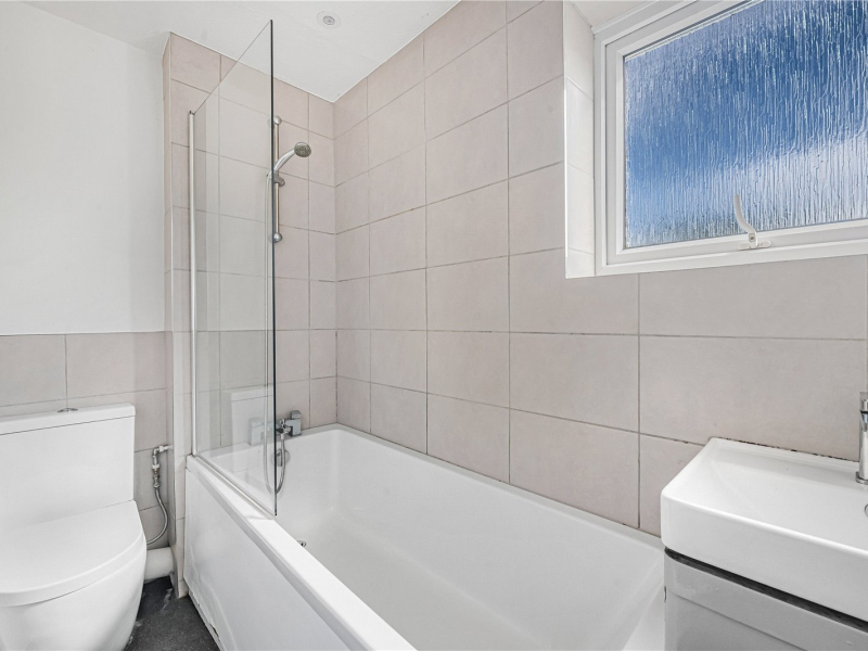 The bathroom is fitted with a bath and overhead shower, WC, and wash basin.