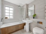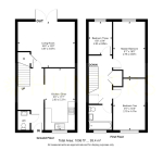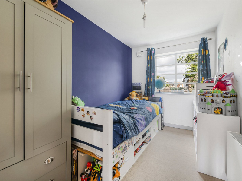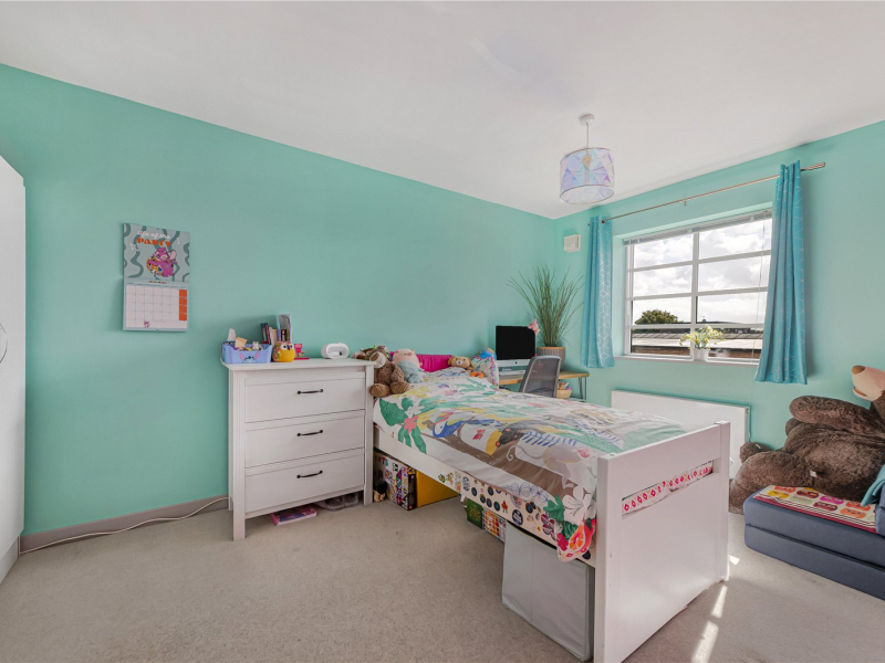 Upstairs, the first floor offers three well-proportioned bedrooms and a modern family bathroom. The master bedroom overlooks the rear garden, while the second bedroom faces the front. Both rooms provide space for freestanding bedroom furniture. The third bedroom is a generous single – ideal for a child’s room, guest room, or home office. The family bathroom includes a bath with overhead shower, WC, and washbasin. A large storage cupboard is also accessible from the landing.