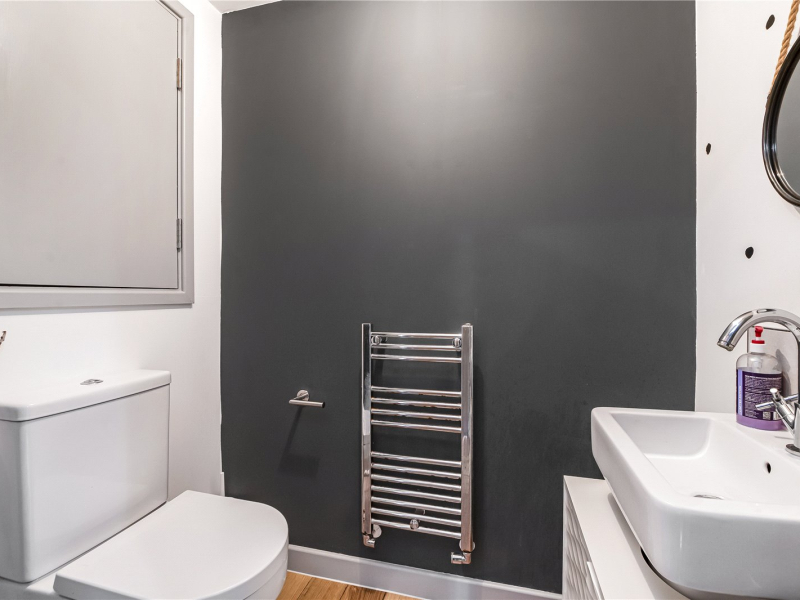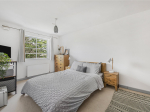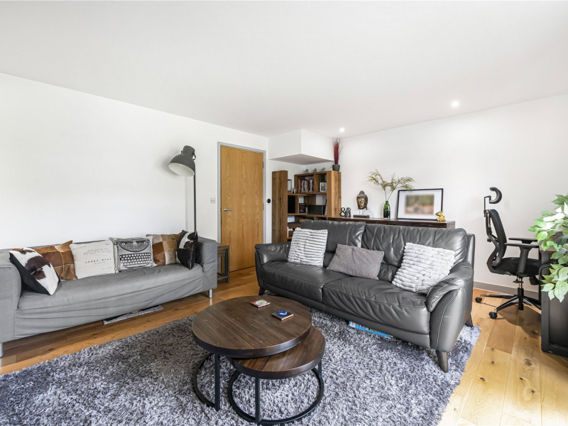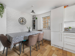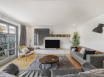 At the rear of the property is a bright and spacious living room, featuring French doors that open onto the garden. There’s ample space for essential lounge furniture, creating a comfortable and functional living area.