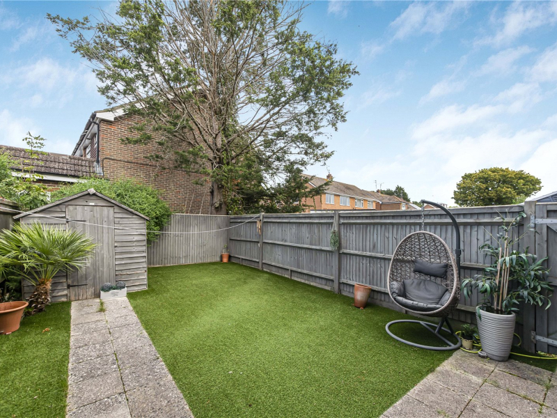 The rear garden is designed for low maintenance and features a paved patio area, a level astro-turf lawn, a pathway leading to a useful storage shed, and convenient side access.