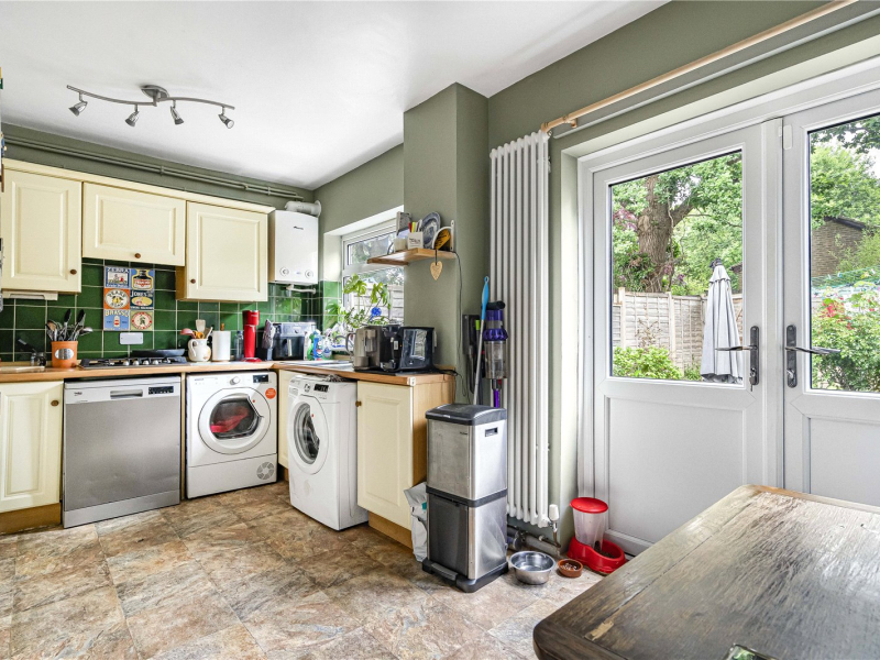 The house is well laid out over two floors and offers a great balance of space. On the ground floor, you’re welcomed into a spacious porch area with plenty of room for coats and shoes. This leads into a bright and airy living room, which flows through to a generous kitchen/diner at the rear – a great space for both day-to-day living and entertaining. The kitchen has room for freestanding appliances, including a washing machine, dishwasher, tumble dryer, and a large fridge/freezer. French doors at the rear open out to the garden, allowing in plenty of natural light.