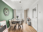 The front of the house is neatly landscaped with two private parking spaces. Inside, the porch provides a welcoming introduction leading to the lounge with understairs storage and stairs rising to the first floor. To the front is a bright living room finished with contemporary wood-effect flooring, spotlights and stylish fittings, while to the rear lies the dining room. Designed with both practicality and entertaining in mind, the kitchen features white units, classic subway tiling, and an integrated oven and 4 ring gas hob. From the kitchen there is also access to a utility room with space for a fridge/freezer and washing machine.
