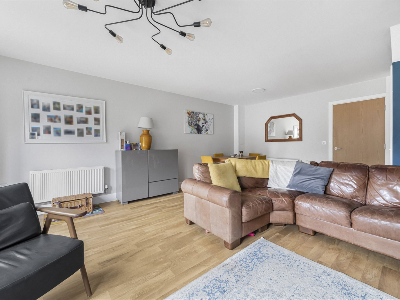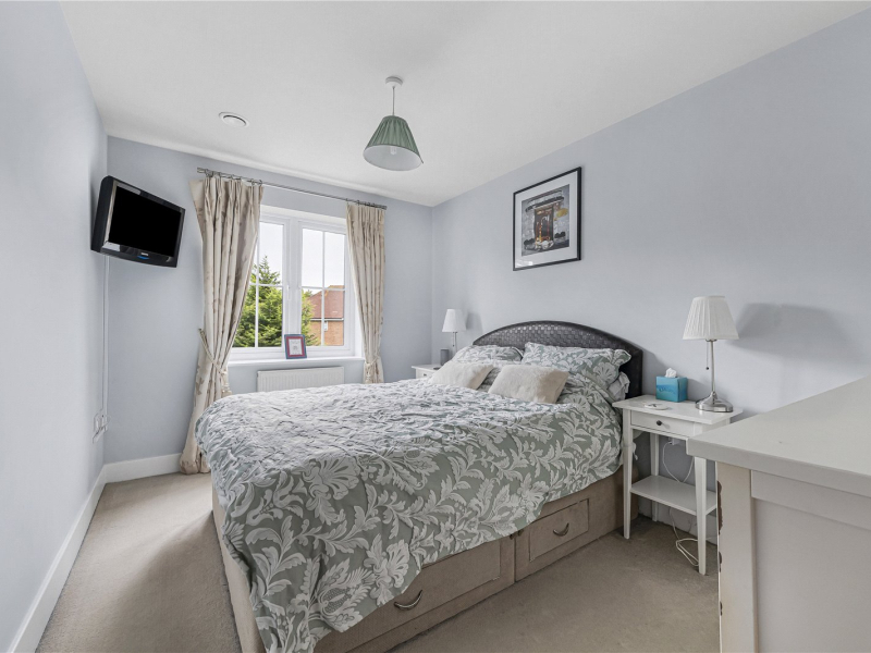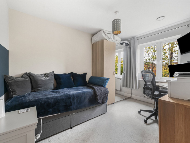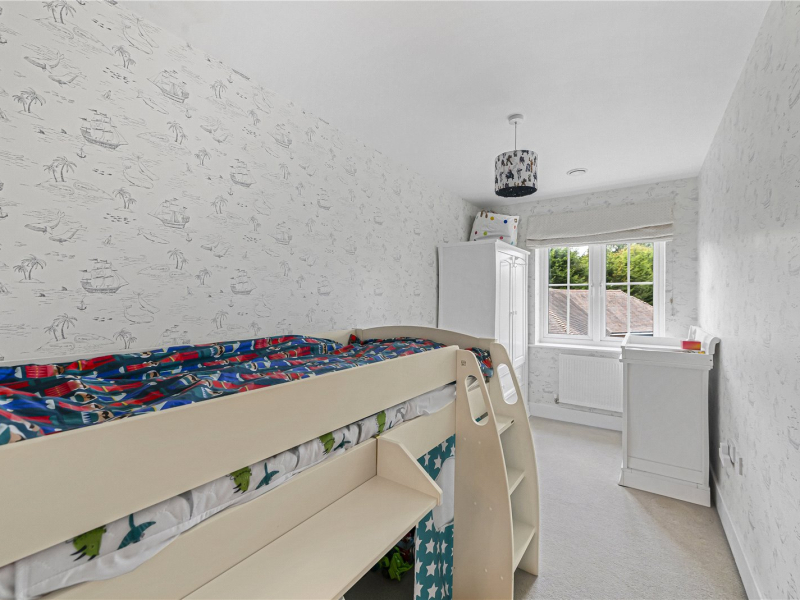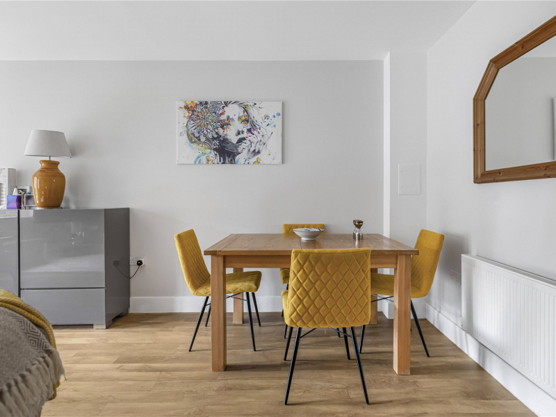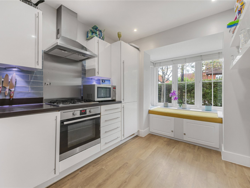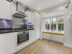 The kitchen benefits from ample worktop and cupboard space and comes complete with integrated appliances — including a washing machine, dishwasher, fridge/freezer, oven, and hob. At the front, a built-in bay window seat with integrated storage creates a cosy breakfast nook or reading spot, while also allowing plenty of natural light to fill the room.