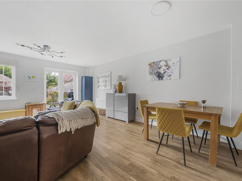 To the rear of the ground floor is a large open-plan living/dining room, perfect for modern family living. Double doors open directly onto the rear garden, offering a seamless indoor-outdoor flow, ideal for entertaining. There is also a useful under-stairs storage cupboard.