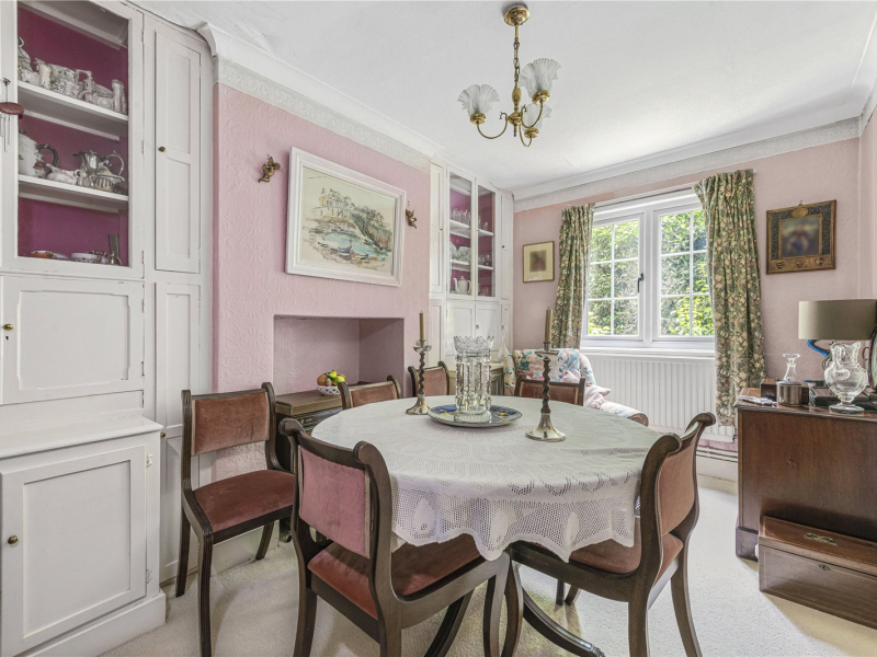 To the front of the property, there is a conservatory room that serves as a practical entrance space—ideal for storing coats, shoes, and other daily essentials. From here, you enter the kitchen, which offers ample under- and over-counter storage, as well as a large walk-in pantry. The kitchen leads into the main hallway, where you’ll find a downstairs WC, a formal dining room with original period features, and a spacious triple-aspect living room boasting a wood-burning fireplace—perfect for relaxing and entertaining.