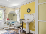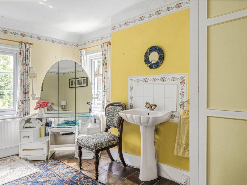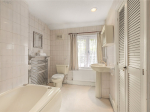 Upstairs, the master bedroom is generously sized and filled with natural light from its triple-aspect windows. Two additional bedrooms—each with a wash basin—are served by a well-appointed family bathroom that includes a bath, overhead shower, and useful built-in storage, including an airing cupboard and linen cupboard.