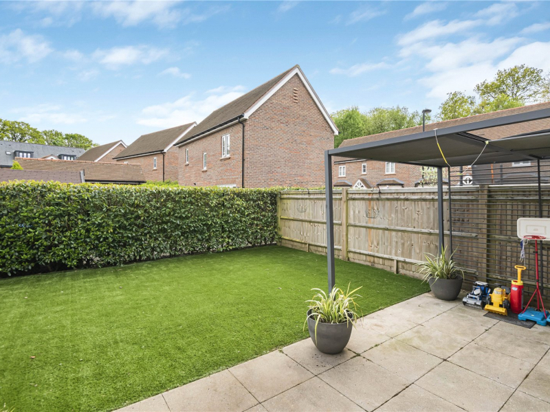 Outside, the private southeast-facing garden has been landscaped for low maintenance and year-round appeal — with a patio area and a level lawn professionally laid with premium artificial grass — creating a terrific setting for children, pets, or outdoor entertaining. Finally, a gated side entrance provides convenient access to the driveway or for gardeners and cyclists.