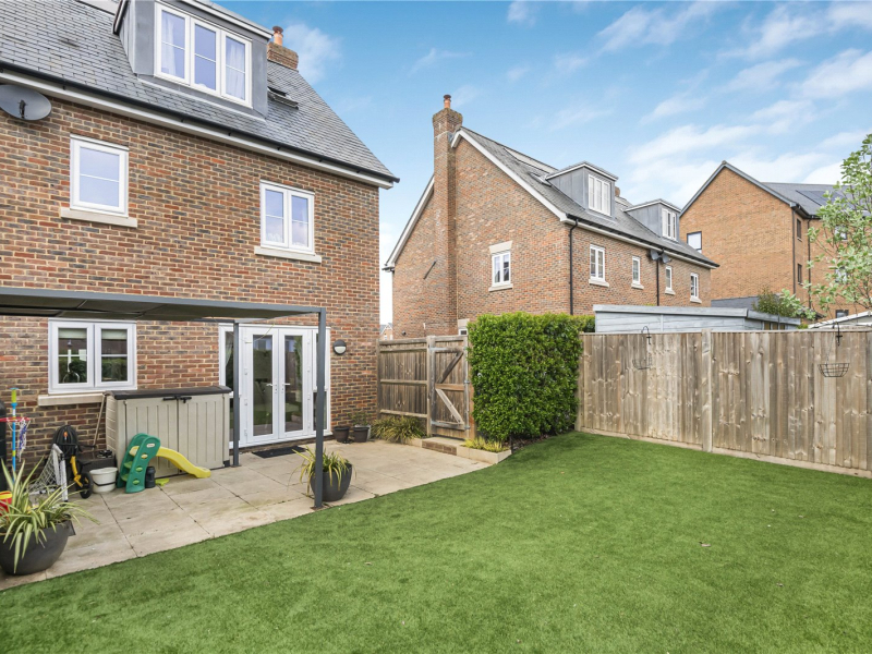 This well-presented home comes with NO ONWARD CHAIN and offers a spacious kitchen-diner, bright living room, and three double bedrooms (two with en-suites), plus excellent storage throughout. The top floor serves as a flexible principal suite or games room, and the southeast-facing garden is low-maintenance and perfect for entertaining. A long driveway provides parking for up to three cars, with additional public bays directly opposite.