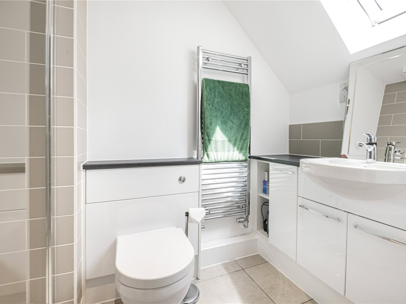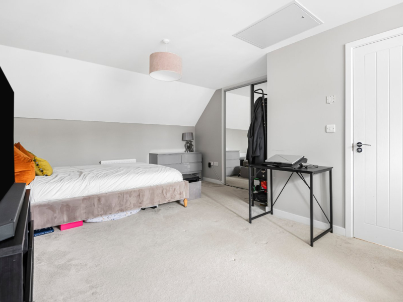 The second floor is dedicated to a superb principal suite, currently used as a versatile games room and guest space, with excellent proportions, a built-in wardrobe, en-suite shower room, and peaceful views over the rear garden. The loft has also been professionally boarded, providing substantial additional storage space.