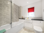 The first floor offers two well-proportioned bedrooms, both with built-in wardrobes. The larger, bay-fronted bedroom benefits from an ensuite shower room with a modern white suite, while the third bedroom is also generously sized. A stylish family bathroom with a contemporary white suite and coordinating tiling completes this floor.