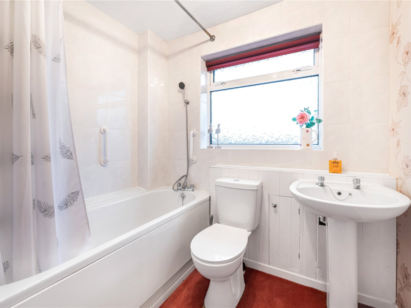 Upstairs, there are three well-proportioned bedrooms. The two larger bedrooms both feature built-in sliding wardrobes and still allow room for additional furniture, with the main bedroom overlooking the front and the second bedroom overlooking the rear garden. The third bedroom is a comfortable single and includes a built-in storage cupboard. The family bathroom is fitted with a bath and overhead shower, WC and wash hand basin. The landing also benefits from a further storage cupboard.