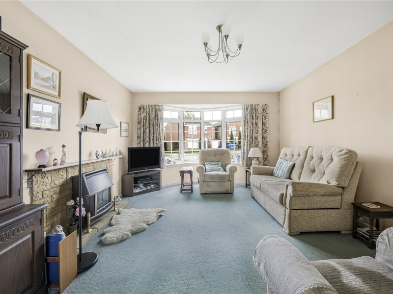 The property is entered via a spacious entrance hallway with stairs to the first floor and useful under-stairs storage space. A downstairs WC is located to the left, with doors leading to the living room and kitchen. The living room is a bright, dual-aspect space with a large bay window to the front and sliding doors opening onto the rear garden, allowing plenty of natural light. There is ample space for freestanding furniture.