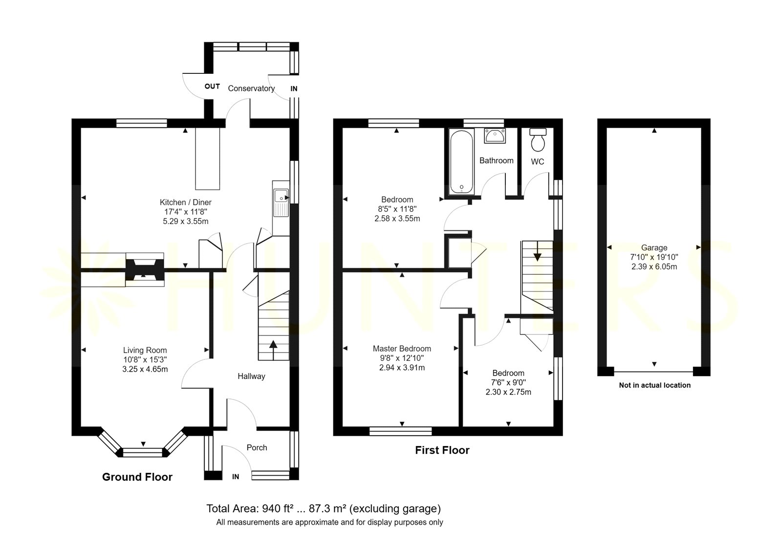 To the left is the living room, featuring a large bay window that fills the space with natural light. To the rear of the property, the kitchen/diner offers two generous storage cupboards and space for freestanding appliances and furniture. A large, bright window overlooks the rear garden. From the kitchen, a conservatory provides access to the side of the property and the rear garden.