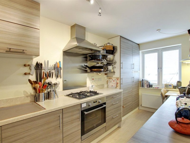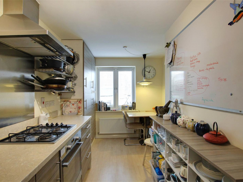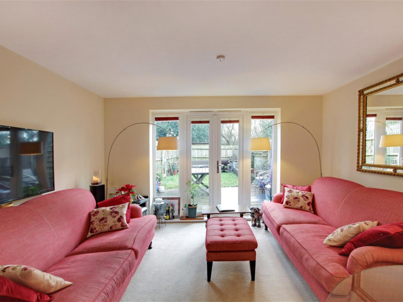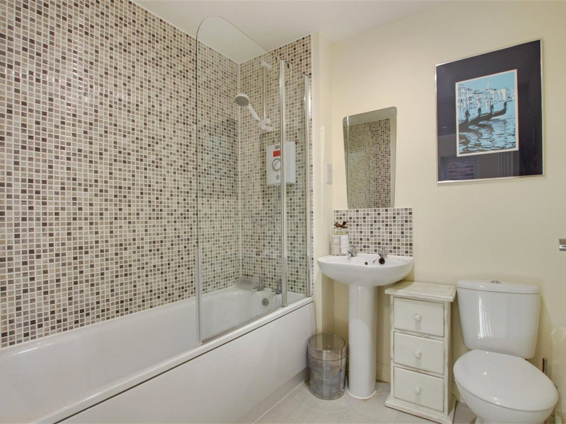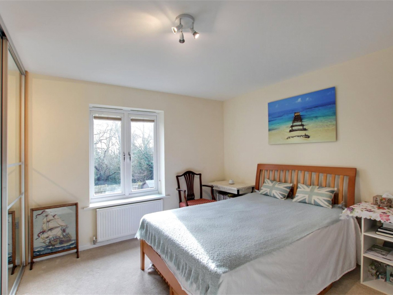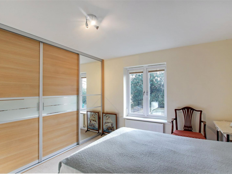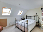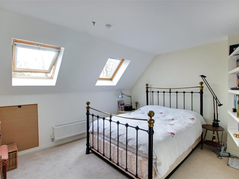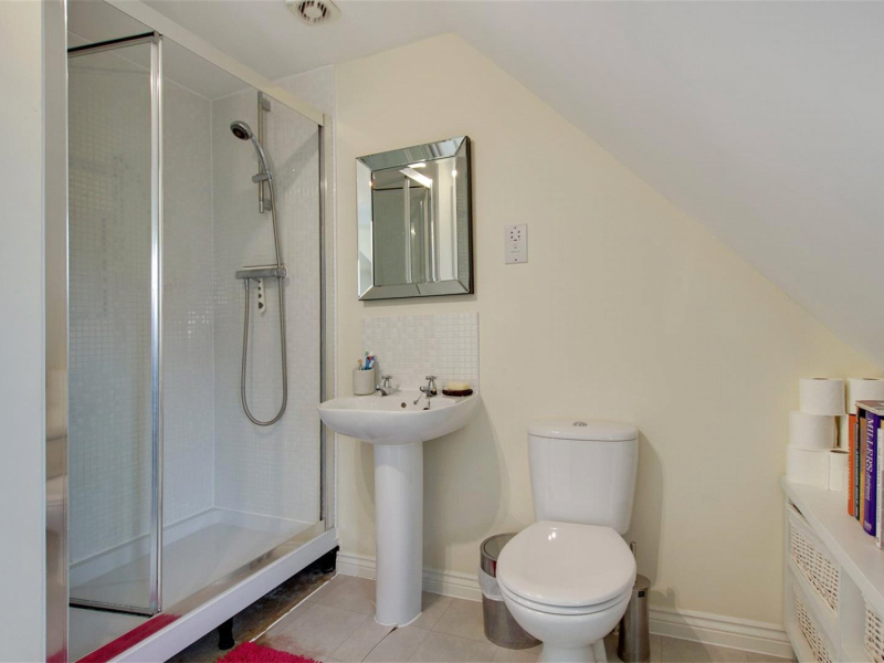 On the first floor, there are two bedrooms, the larger of which benefits from custom floor-to-ceiling wardrobes, and a family bathroom with bath and electric shower. The smaller bedroom is ideal as a child’s room or home office. The second floor is dedicated to a generous master bedroom with eaves storage, south-facing Velux windows with integrated blackout blinds, a large storage cupboard, double wardrobe, and a modern en-suite shower room.