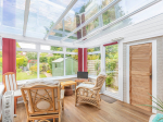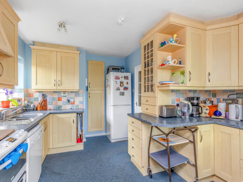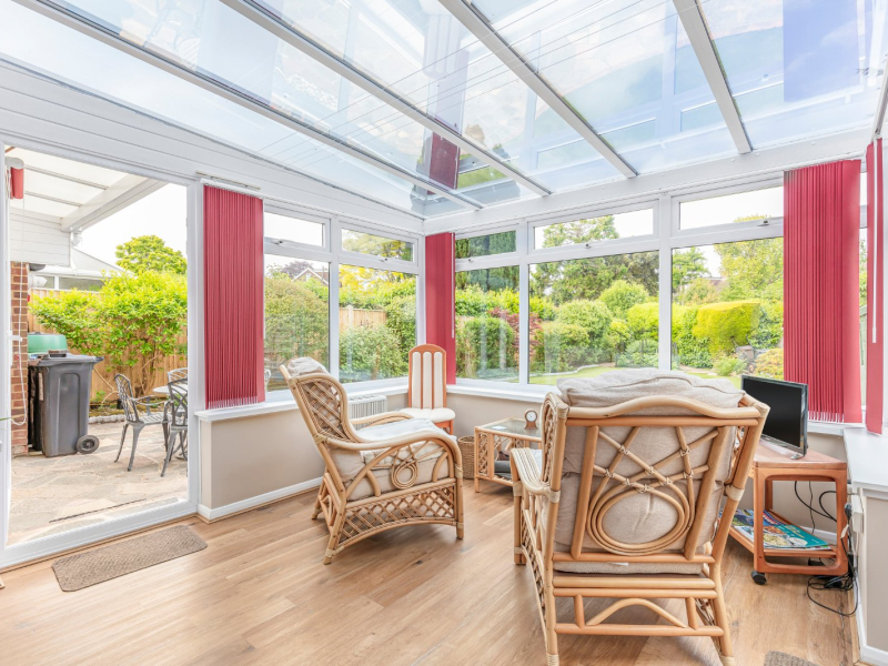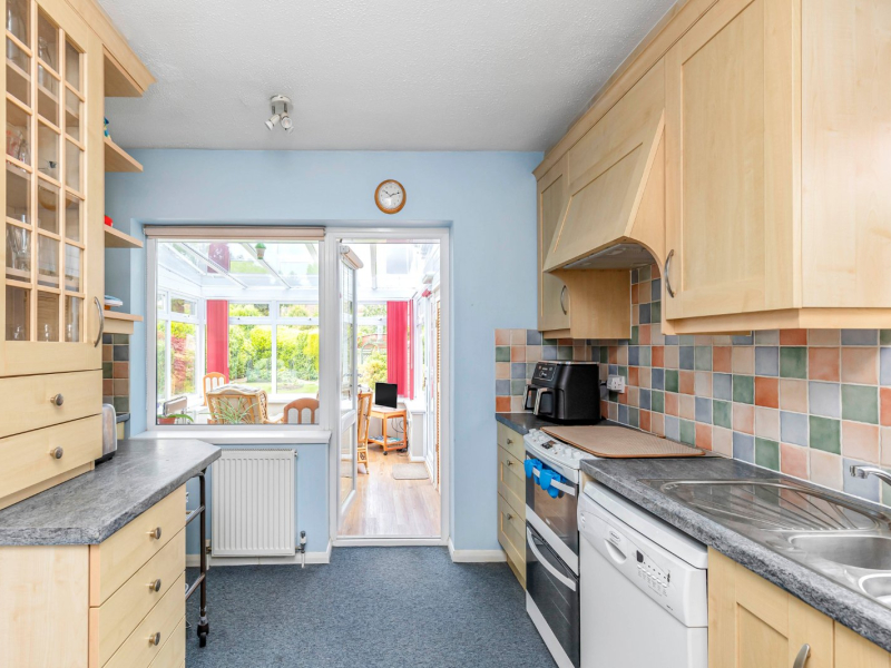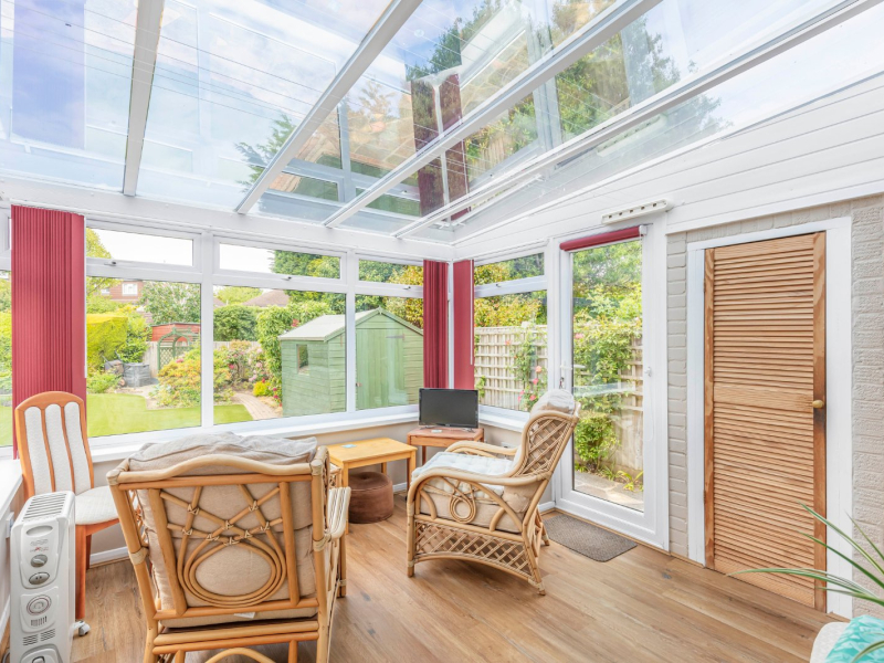 To the rear, the kitchen – featuring a 4-ring gas hob and oven, a 1.2 stainless steel sink and drainer, leads into a lovely conservatory-style garden room—a bright and airy space overlooking the garden and perfect for everyday dining. Two useful built-in cupboards provide extra storage.