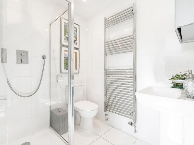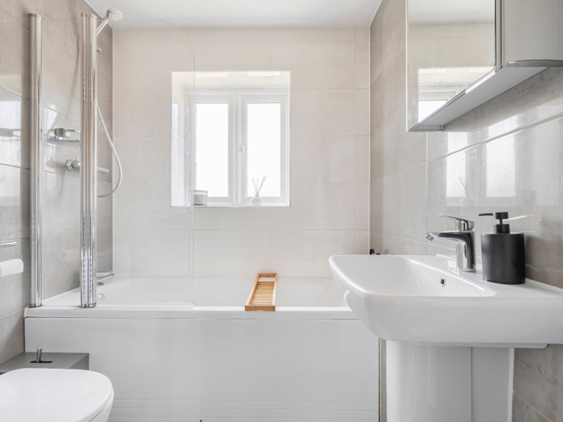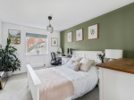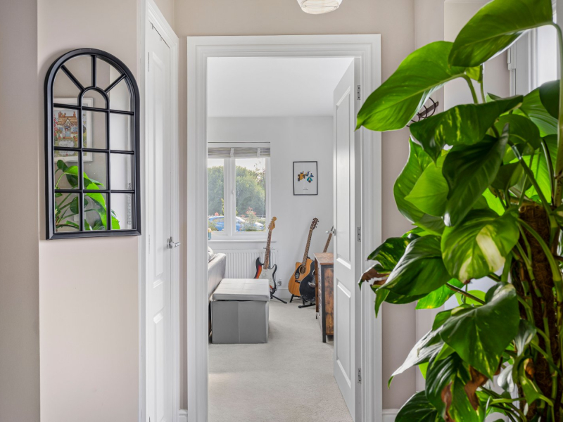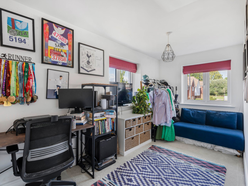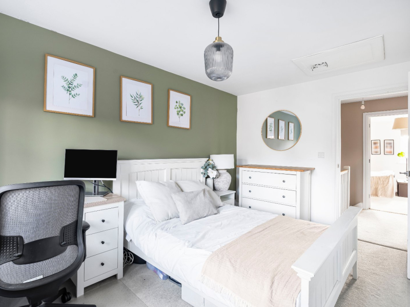 Upstairs, the sense of space continues with a bright landing that incorporates a shelved cupboard. The master bedroom is particularly impressive, enjoying a dual aspect with views over the green, as well as a stylish en-suite shower room. Two further bedrooms provide versatile accommodation, equally suited to children, guests, or working from home, while the family bathroom is finished to a high standard with a modern suite including both a bath and a separate overhead shower.