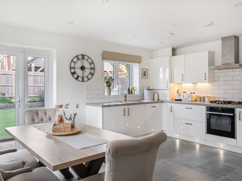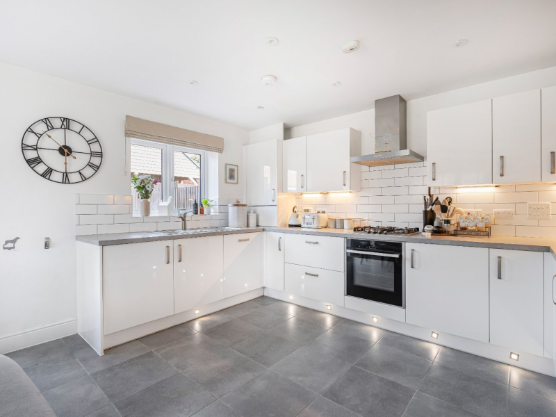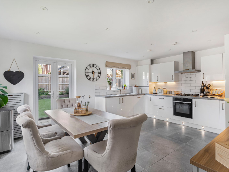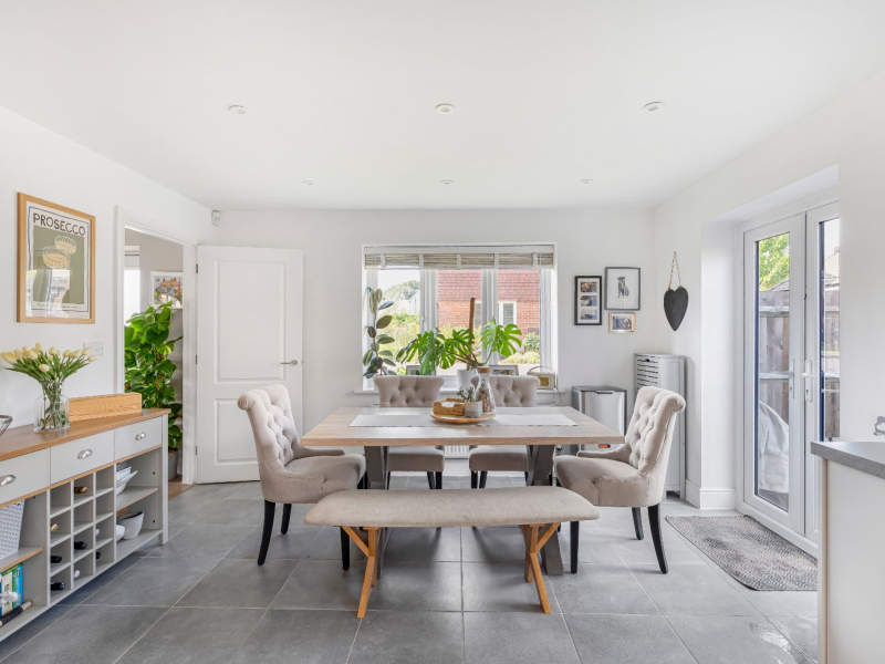 Inside, the property is beautifully presented and thoughtfully laid out to create a home that is both practical and welcoming. The entrance hall offers an immediate sense of space, with a useful built-in cupboard for storage and a cloakroom, while a staircase rises to the first floor. To the rear of the property, the kitchen and dining room enjoy a double aspect and are fitted with a smart range of modern grey units, complemented by a full suite of integrated appliances. French doors open directly onto the garden, seamlessly connecting indoor and outdoor living spaces and making this an ideal setting for entertaining. The living room also benefits from a dual aspect, ensuring it is light and airy throughout the day, and offers generous proportions that provide plenty of room for both relaxation and family gatherings.