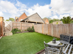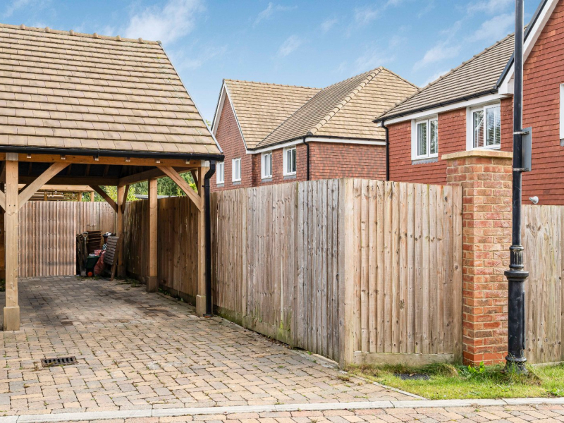 Outside, the property continues to delight. To the front, the wide lawn is bordered with attractive planting and looks directly across the green, giving the house a wonderful sense of openness and privacy. A side gate leads through to the rear garden, which faces north-east and measures approximately 27 feet by 20 feet. This private space is mainly laid to lawn, with raised sleeper beds providing a splash of colour and seasonal interest, and an outside tap adds convenience. To the side, a double-length carport provides secure and sheltered parking for two vehicles, a real advantage within this popular development.