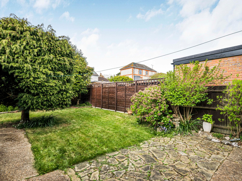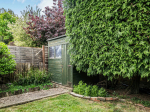 The private rear garden is mainly laid to lawn, bordered by mature shrubs and greenery, creating a tranquil outdoor space. A patio area by the house is perfect for outdoor dining, and a pathway leads to a timber shed at the rear.