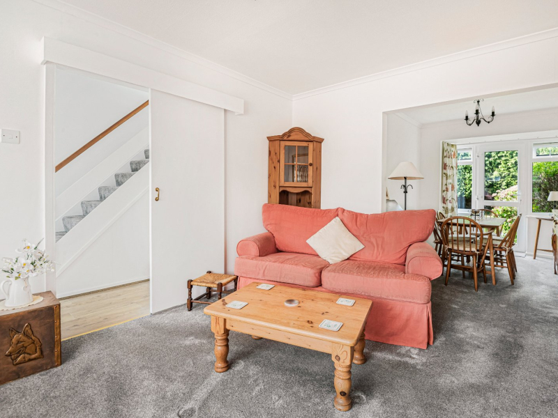 Inside, a welcoming entrance hall provides storage for coats and shoes, with stairs leading to the first floor. To the right, a bright and spacious open-plan living/dining room benefits from dual-aspect windows, including a bay window to the front and patio doors to the rear garden—flooding the space with natural light. There is ample space for freestanding furniture and entertaining.