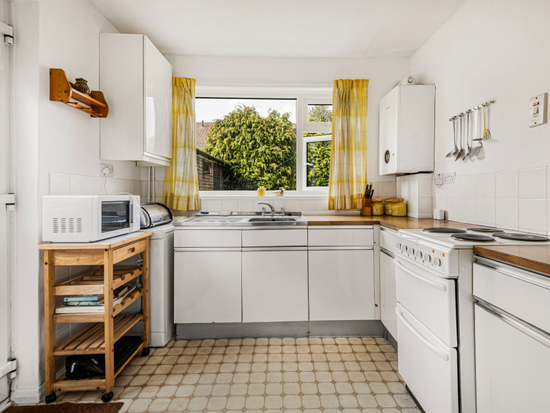 Adjacent, the separate kitchen overlooks the rear garden and includes a large pantry, with space for a freestanding oven, washing machine, and tall fridge/freezer. A side door provides convenient access to the garden.