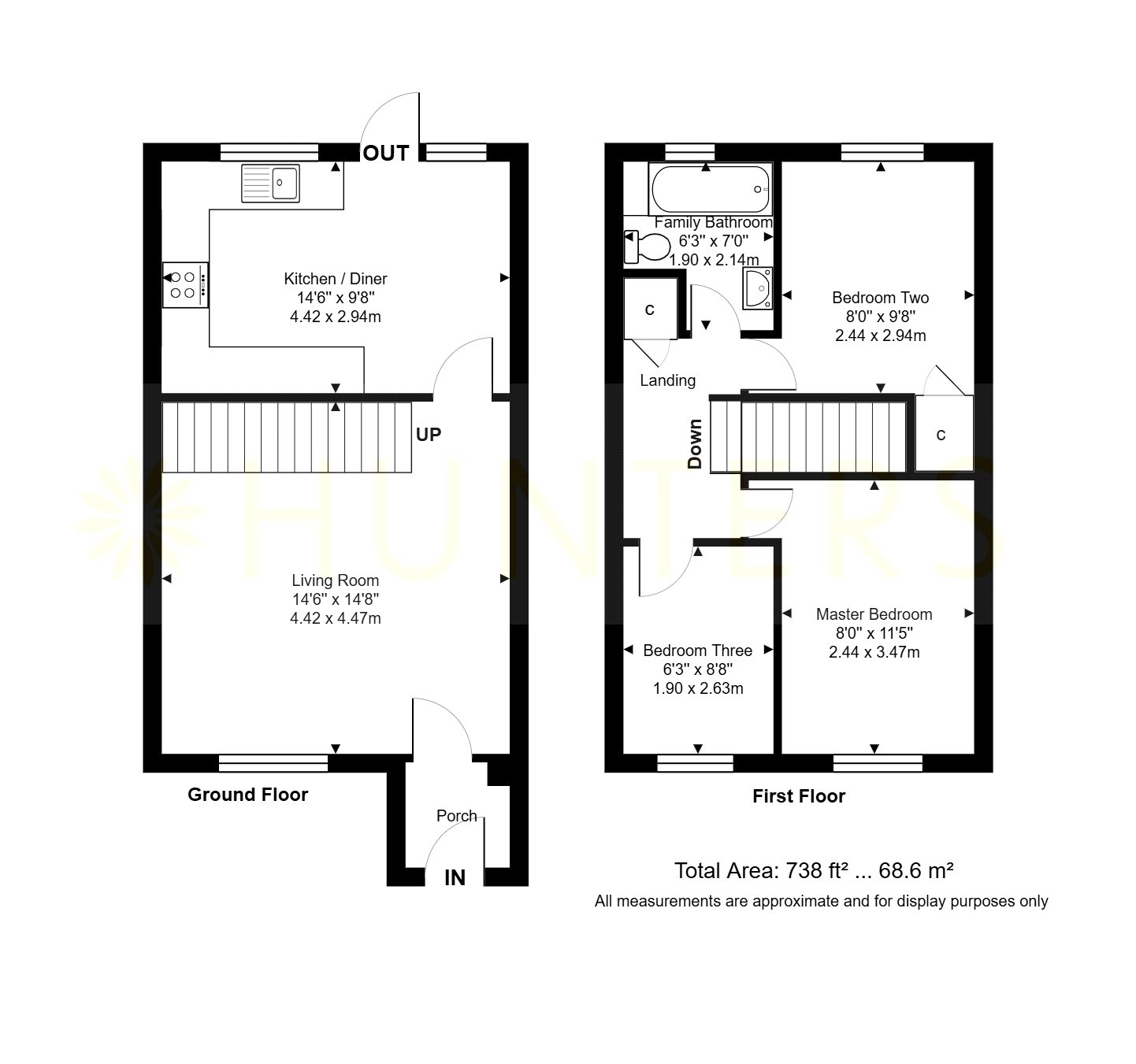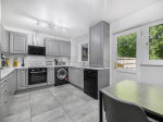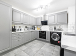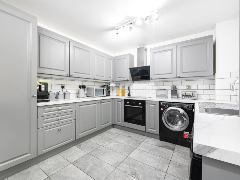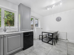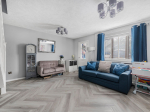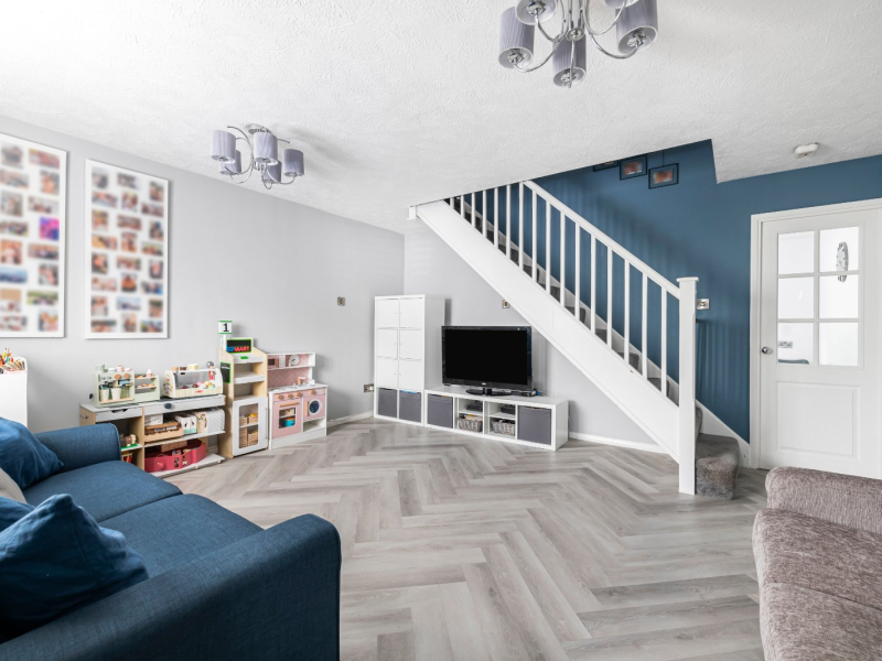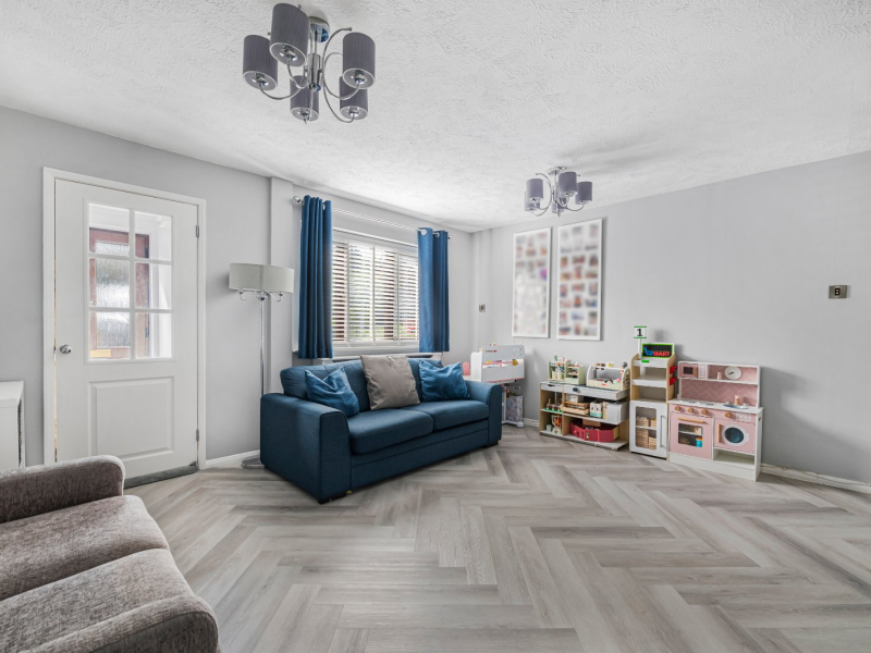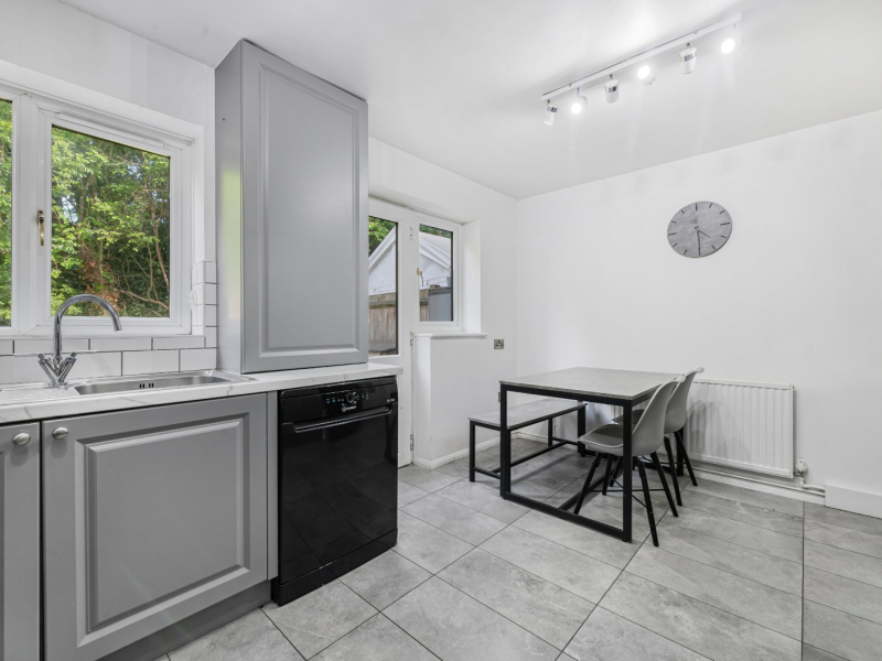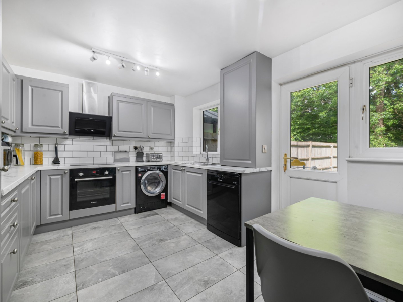 The property boasts a spacious front driveway, providing parking for multiple vehicles. Upon entry, you’re welcomed into a bright and airy porch, perfect for storing coats and shoes. The generous living room offers ample space for free-standing furniture and provides access to the first floor. At the rear of the property, the kitchen/diner is perfect for family meals, featuring white marble-effect worktops, grey cupboard doors, and plenty of counter space. It is well-equipped with room for a washing machine, dishwasher, and an integrated oven and electric hob.