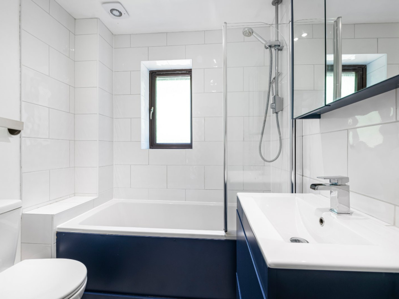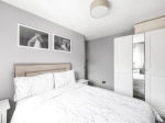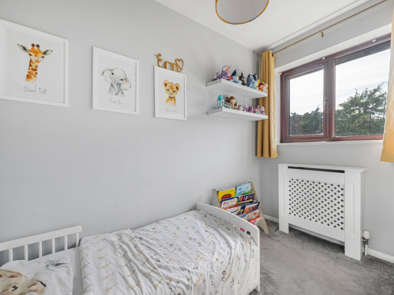 The first floor offers a landing that leads to three bedrooms and a family bathroom. Two of the bedrooms are good size doubles, both providing space for free-standing furniture, with the second bedroom also benefiting from a built-in storage cupboard. The third bedroom is a single. The family bathroom is beautifully styled with white tiles and distinctive patterned flooring, creating a modern, stylish feel.
