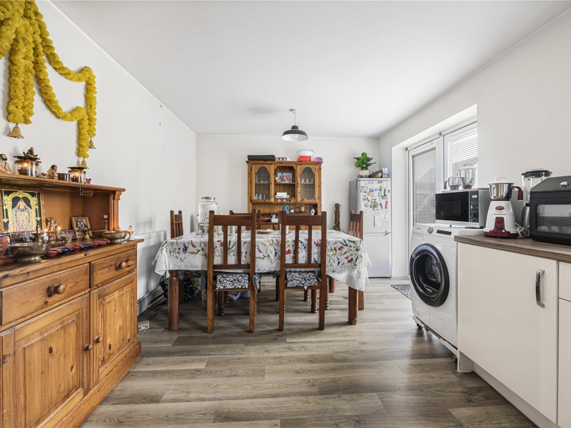 The living room is generously sized and offers plenty of space for free-standing furniture. A large front-facing window floods the room with natural light. At the rear of the property is an open-plan kitchen/diner, featuring ample under- and over-counter storage. The kitchen comes equipped with integrated appliances, including a gas oven and hob, fridge/freezer, dishwasher, and washing machine. French doors open out to the garden, creating a seamless indoor-outdoor living space.