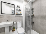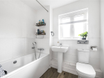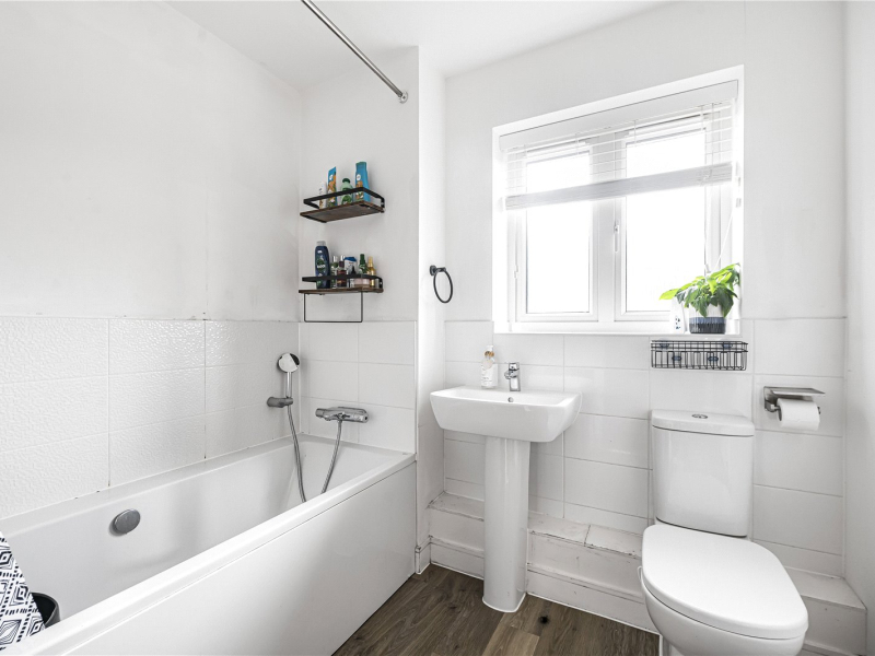 The first floor features three double bedrooms. The master bedroom overlooks the rear garden and includes an en-suite with a walk-in shower, toilet, and sink. There’s also a modern family bathroom with a bath, toilet, and sink. Additional storage is available in a large cupboard on the landing.
