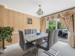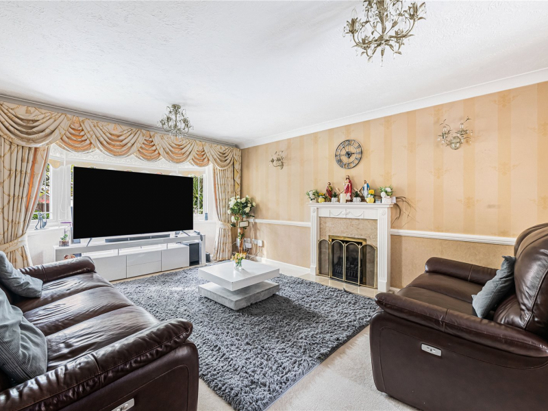 To the left of the hallway is the main living room, featuring a large front-facing bay window and a fireplace, creating a cosy and inviting space. Double doors lead through to the dining room, which benefits from sliding glass doors opening out to the garden.